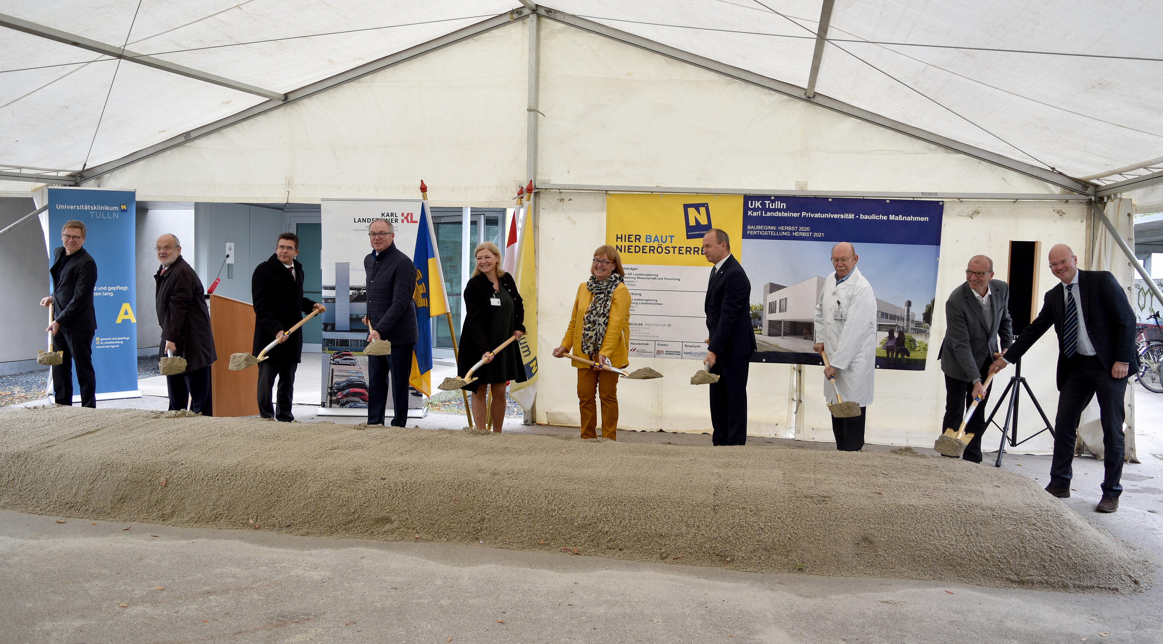Gemeinsam mit Landeshauptfraustellvertreter Dr. Stephan Pernkopf, Tullns Bürgermeister Mag. Peter Eisenschenk, Vorstand der NÖ Landesgesundheitsagentur Mag. Mag. (FH) Konrad Kogler, Geschäftsführer der Gesundheit Region Mitte GmbH Dipl. Ing. Franz Laback, MBA, Klinikleitung des Universitätsklinikums Tulln, Direktorin der Gesundheits- und Krankenpflegeschule DGKP Rosa Dolezal, Dipl. Ing. Josef Bichler und Ing. Wolfgang Zehetner von der BD6, sowie Abteilungsvorstand der Kinder- und Jugendpsychiatrie und -psychotherapie Assoc. Prof. Dr. Paulus Hochgatterer erfolgte – mit dem aktuell nötigen Abstand – der Spatenstich zum Ausbau eines modernen Ausbildungszentrums.