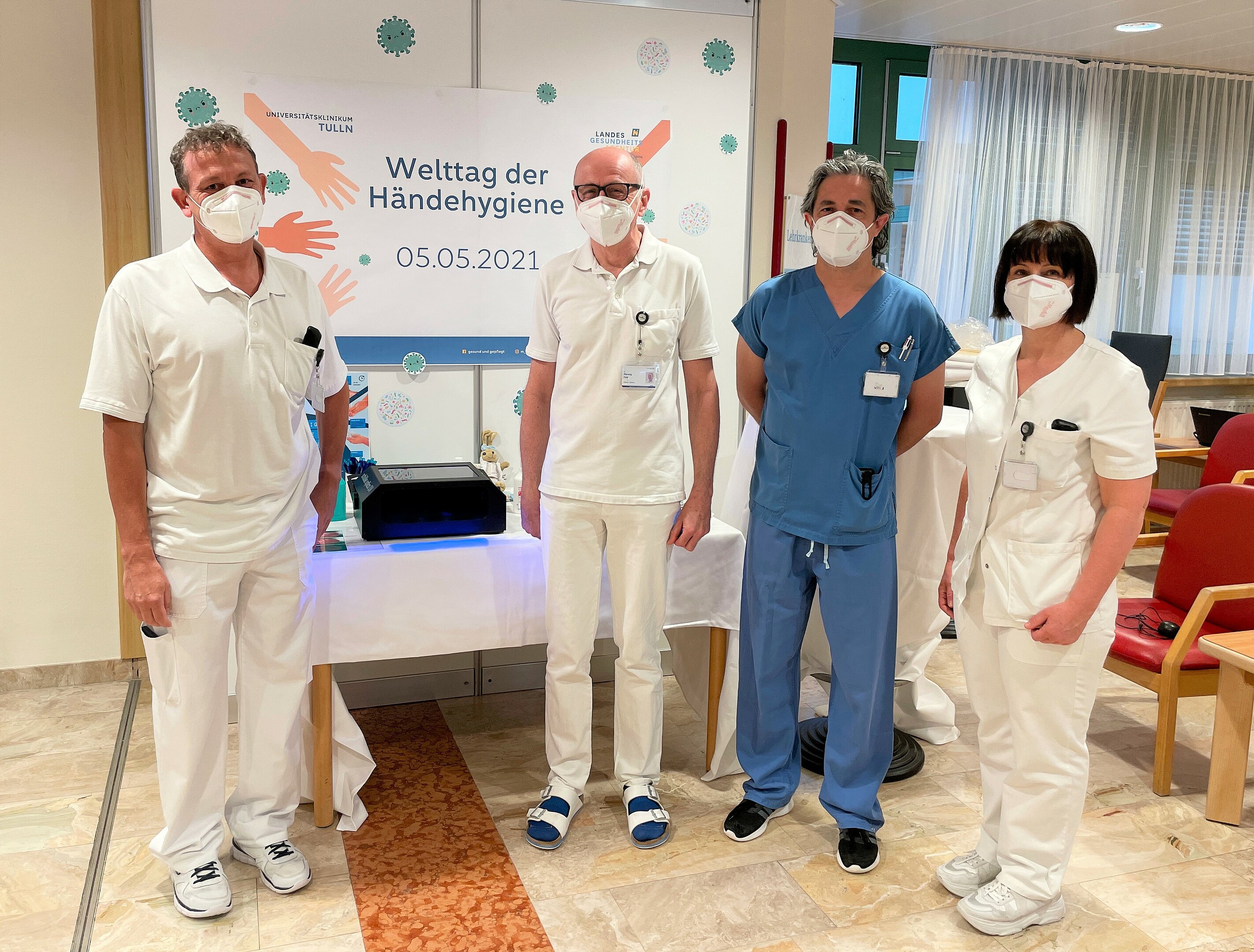 Um dieses wichtige Thema auch unseren PatientInnen näherzubringen, veranstaltete das Team der Krankenhaushygiene des Universitätsklinikum Tulln am 05. Mai 2021 einen Info-Vormittag im Ambulanzbereich und stand für die Beantwortung aller Fragen rund um das Thema Hygiene zur Verfügung. In einer speziellen UV-Licht-Box konnten PatientInnen aber auch MitarbeiterInnen mithilfe eines fluoreszierenden Desinfektionsmittels erkennen, ob die Händedesinfektion ausreichend durchgeführt wurde.